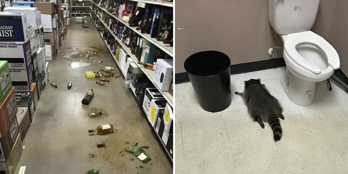 Пьяный енот-рецидивист стал звездой в Сети: он устроил погром в винном магазине и отключился в уборной